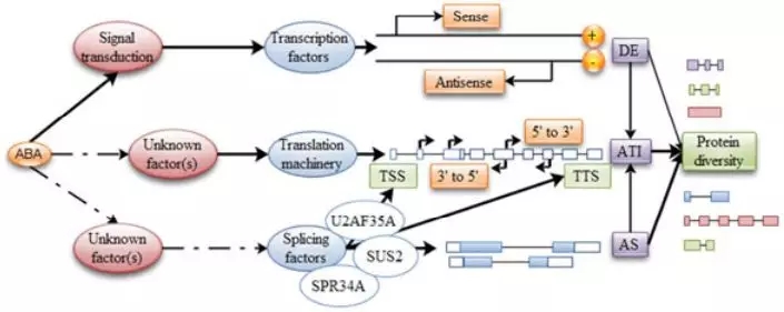 FY Zhu[3]等通過轉(zhuǎn)錄組和蛋白組的聯(lián)合分析揭示了擬南芥在脫落酸響應(yīng)中的可變剪接和翻譯的分子機制,結(jié)果中發(fā)現(xiàn)相比于基因的差異表達,發(fā)生差異可變剪接的基因功能多集中在三羧酸循環(huán)、光合作用等途徑,表明在對ABA響應(yīng)中,相對基因表達,轉(zhuǎn)錄本的結(jié)構(gòu)變化可能起更為重要的作用,且差異可變剪接事件更容易翻譯成蛋白行使生物學(xué)功能。