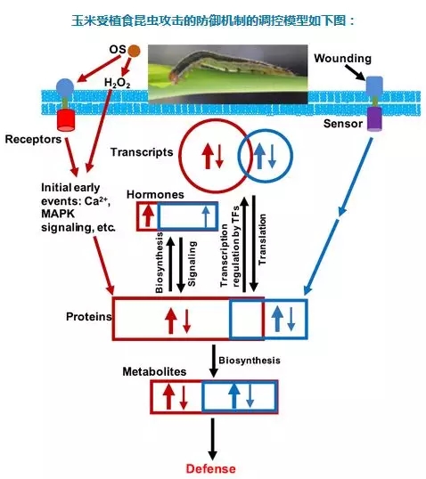 Qi J[4]等,利用多組學(xué)(轉(zhuǎn)錄組學(xué)、蛋白組學(xué)、代謝組學(xué))技術(shù),探索了玉米受植食昆蟲攻擊的防御機制,并構(gòu)建繪制了系統(tǒng)的調(diào)控模型。這些數(shù)據(jù)對玉米防御昆蟲災(zāi)害的進一步遺傳學(xué)研究搭建了很好的框架,也為抗昆蟲災(zāi)害的玉米新品種的培育奠定了良好的基礎(chǔ)。