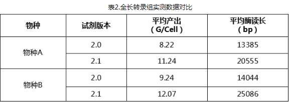 ? ? ? 本次2.1版本試劑的發(fā)布,在全長轉(zhuǎn)錄上的實測亦有優(yōu)異的表現(xiàn)。通過實測發(fā)現(xiàn),2.1版本試劑數(shù)據(jù)產(chǎn)出較升級前的8-9G/Cell提升到了11-12G/Cell的平均水平。同時,平均酶讀長也達到了20K以上。酶讀長的有效增加,有利于拿到更多的高質(zhì)量全長轉(zhuǎn)錄數(shù)據(jù),從而有效提高全長轉(zhuǎn)錄組的分析質(zhì)量。