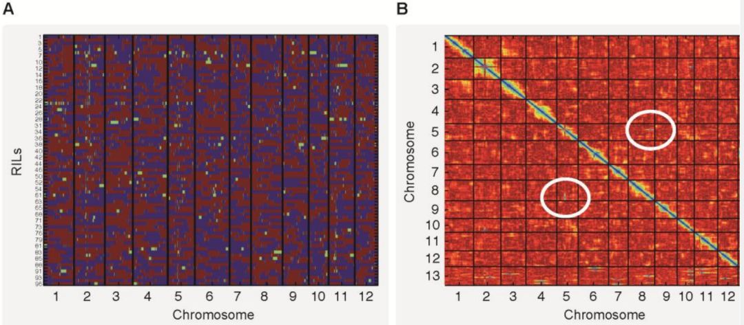 圖1? ? ? ?A)重組bin圖? ? ? ?B)標記間關(guān)系熱圖