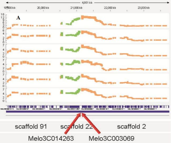 轉(zhuǎn)錄組測序:授粉10-20天,每個line取5株甜瓜的果肉混樣提取RNA,Illumina GAII和HiSeq 2000測序