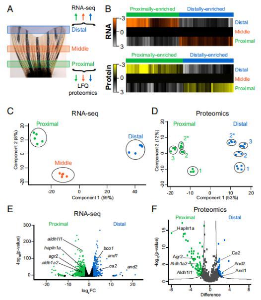 ????????為了鑒定可能參與尾鰭位置記憶的候選分子,本研究對未受傷的斑馬魚尾鰭的近端,中間和遠(yuǎn)端區(qū)域進(jìn)行了RNA測序(RNA-seq)和無標(biāo)記定量(LFQ)蛋白質(zhì)組學(xué)(圖1A),共鑒定出566個(gè)轉(zhuǎn)錄本和238個(gè)蛋白質(zhì),主要存在于近或遠(yuǎn)的富集梯度中(圖1B)。另外,主成分分析(PCA)顯示鰭的近端和遠(yuǎn)端區(qū)域之間的轉(zhuǎn)錄物(圖1C)和蛋白質(zhì)(圖1D)豐度的變化很大。中間區(qū)域的轉(zhuǎn)錄本聚集成一個(gè)獨(dú)特的組,但更接近于遠(yuǎn)端區(qū)域(圖1C)。差異豐富分子的最大差異發(fā)生在近端和遠(yuǎn)端區(qū)域之間,包括1,424個(gè)轉(zhuǎn)錄本和113個(gè)蛋白質(zhì)(圖1E)。因此,基因組的表達(dá)在整個(gè)尾鰭的近遠(yuǎn)端軸上存在著定量的差異。