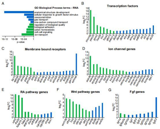 為了確定沿尾鰭近遠(yuǎn)端軸線差異表達(dá)的分子類型,因此對RNA-seq數(shù)據(jù)進(jìn)行了GO分析(圖2A)。轉(zhuǎn)錄因子是細(xì)胞識別的主要監(jiān)管者,因此是位置記憶效應(yīng)物的最佳候選者。在作者的RNA-seq數(shù)據(jù)中編碼轉(zhuǎn)錄因子的693個(gè)mRNA中,有53個(gè)在尾鰭前緣和末端區(qū)域差異表達(dá)(圖2B)。對應(yīng)于964個(gè)跨膜受體中的80個(gè)和222個(gè)離子通道蛋白中的55個(gè)的RNAs在近端和遠(yuǎn)端區(qū)域之間差異表達(dá)。這些命中包括谷氨酸和多巴胺可吸收G蛋白偶聯(lián)受體和幾個(gè)Ca2+和K+可滲透通道(圖2C和D)。此外,作者發(fā)現(xiàn)與先前不涉及生長控制或再生的細(xì)胞信號傳導(dǎo)途徑相關(guān)的跨膜蛋白的差異表達(dá),如ephrin和ednrab。RA,WNT和FGF信號傳導(dǎo)等幾種途徑在附肢發(fā)育和再生期間已知在生長控制和圖案化中的作用,這些信號通路分別包含55,52和41個(gè)基因,并確定了12個(gè)RA,13個(gè)WNT和10個(gè)FGF信號傳導(dǎo)途徑基因相反的轉(zhuǎn)錄梯度(圖2E-G)。