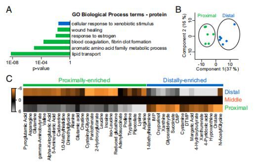 除了遺傳編碼的線索之外,代謝產(chǎn)物可能有助于位置記憶。另外還發(fā)現(xiàn),幾種代謝酶沿尾鰭的近端軸線差異表達(dá),包括aldh1l1。此外,近期富集蛋白的GO分析鑒定出與氨基酸代謝和脂質(zhì)轉(zhuǎn)運(yùn)有關(guān)的蛋白質(zhì)(圖3A)。使用質(zhì)譜法分析未損傷尾鰭的近端,中間和遠(yuǎn)端區(qū)域的代謝物,單個(gè)魚鰭樣品中共定量出125種代謝物。PCA將近端和遠(yuǎn)端魚鰭區(qū)域的代謝物富集聚集成不同的組(圖3B)。幾種代謝產(chǎn)物的豐度在近端和遠(yuǎn)端區(qū)域之間存在差異;26個(gè)近端富集,16個(gè)遠(yuǎn)端富集(圖3C)。
