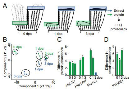 為了檢驗(yàn)這種預(yù)測,分別于截肢后1、3天(dpa),在blastema形成期和生長期(圖4A)對再生鰭的片段進(jìn)行LFQ蛋白質(zhì)組學(xué)研究。為了減少魚類之間的潛在變異,作者從同一條魚中采集了再生鰭的背側(cè)和腹遠(yuǎn)端區(qū)域(雙截肢)。作者發(fā)現(xiàn)3061種蛋白質(zhì)中有97種、11種和2種在0,1和3dpa的背側(cè)和腹側(cè)-遠(yuǎn)側(cè)位置之間差異表達(dá)。在再生過程中不同時(shí)間蛋白質(zhì)表達(dá)的PCA顯示1和3dpa的樣品聚集成不同的組,在近端或遠(yuǎn)端區(qū)域之間幾乎沒有變化,而在未損傷的鰭(0dpa)中近端和遠(yuǎn)端區(qū)域之間存在更多變異(圖4B)。然而,在1dpa差異表達(dá)的11種蛋白中,6種在未受損魚鰭(0dpa)中也差異表達(dá)。編碼這些蛋白質(zhì)的三個(gè)基因aldh1l1,hsd17b7和muc5.2(圖4C)也通過RNA-seq測量發(fā)現(xiàn)在未受傷的鰭片中差異表達(dá)。UniProt ID F1R4E4的一種無特征蛋白質(zhì),是唯一在0,1和3dpa差異表達(dá)的蛋白質(zhì)(圖4D)。