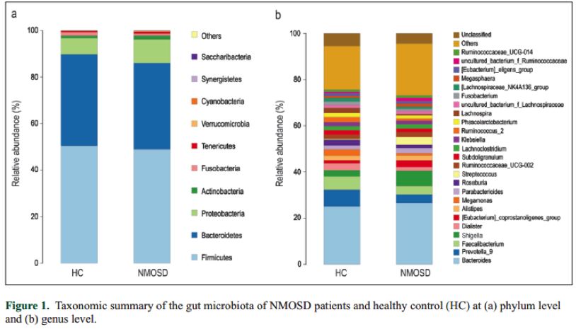 視神經(jīng)脊髓炎譜系疾病NMOSD)是一種中樞神經(jīng)系統(tǒng)(CNS)的炎癥性自身免疫疾病,是視神經(jīng)和脊髓同時(shí)或相繼受累的急性或亞急性脫髓鞘病變。視神經(jīng)脊髓炎譜系疾病具有高復(fù)發(fā)和高致殘性,具有人種差異和性別差異(男女患病比例為1:10),通常與其他自身免疫疾?。ㄈ缦到y(tǒng)性紅斑狼瘡、橋本氏病等)共病。長期以來,NMOSD可通過免疫學(xué)標(biāo)記(如水通道蛋白-4抗體,AQP4-IgG)或遺傳基因標(biāo)記(如人類白細(xì)胞抗原,HLA)鑒定,與幽門螺桿菌等病原相關(guān)的抗體在NMOSD患者的腸胃中也被普遍發(fā)現(xiàn)。NMOSD患者腸道微生物的研究目前仍較少,本文采用高通量測(cè)序(NGS)和氣相色譜(GC)技術(shù),分析了NMOSD患者的腸道微生物與短鏈脂肪酸(SCFAs)變化情況。