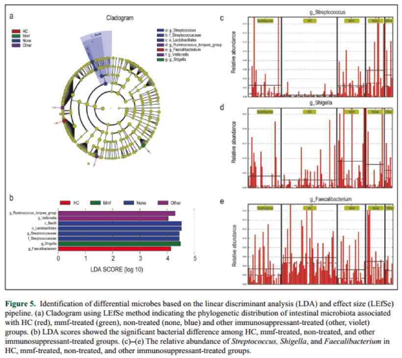 免疫抑制治療比較發(fā)現(xiàn),鏈球菌屬(Streptococcus)、志賀氏菌屬(Shigella)主要集中于NMOSD人群,糞球菌屬(Faecalibacterium)在HC人群中最豐富。與非治療組相比,NMOSDs人群的鏈球菌屬(Streptococcus)在使用mmf、azathioprine后略有降低(圖 5c),但在HC人群中更低。與非治療相比,NMOSDs人群的免疫抑制治療劑(mmf、azathioprine & others)治療對(duì)志賀氏菌屬(Shigella)的抑制作用不明顯(圖 5d)。雖然,HC人群比非治療NMOSDs人群的糞球菌屬(Faecalibacterium)略高,然而,免疫抑制治療劑(mmf、azathioprine)使糞球菌屬(Faecalibacterium)反而顯著降低(圖 5e)。