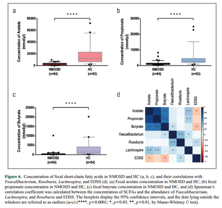 從上述研究發(fā)現(xiàn),NMOSD患者腸道中缺乏合成SCFAs的菌群,但引起該患者癥狀的機(jī)會(huì)致病菌大量繁殖。因此,本文運(yùn)用GC技術(shù)研究NMOSD與HC人群腸道SCFAs(醋酸纖維、丙酸鹽和丁酸鹽),結(jié)果發(fā)現(xiàn),NMOSD患者的3種SCFAs濃度均顯著低于HC人群(p<0.001)(圖 6a-c)。非參數(shù)相關(guān)性分析(Spearman)表明(圖 6d)),SCFAs(醋酸纖維、丁酸鹽)濃度分別與EDSS顯著負(fù)相關(guān)(p<0.05);特異性產(chǎn)SCFAs細(xì)菌(毛螺旋菌Lachnospira)豐度與SCFAs濃度顯著正相關(guān)。此外,mmf、azathioprine及其他免疫抑制治療劑對(duì)SCFAs濃度的影響存在差異。