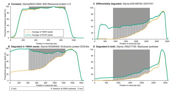 在相隔21年的種子的胚軸中比較mRNA的降解,2015H和1994H分別顯示未衰老和增加衰老癥狀。使用全分子cDNA無打斷的測序方法對RNA進(jìn)行測序。發(fā)現(xiàn)一些轉(zhuǎn)錄本在兩個群組中均有降解,但在1994H種子的組織中觀察到更多的損傷。損傷主要由于片段碎裂造成,如電泳圖譜的變化,轉(zhuǎn)錄本覆蓋長度和測序深度所示。幾乎沒有證據(jù)表明轉(zhuǎn)錄本丟失或引起了氧化損傷。降解轉(zhuǎn)錄本中片段大小的連續(xù)分布以及轉(zhuǎn)錄本長度和降解之間的正相關(guān)支持了通過隨機(jī)片段化造成mRNA降解的假設(shè),這與氧化事件引起死亡的假設(shè)一致。