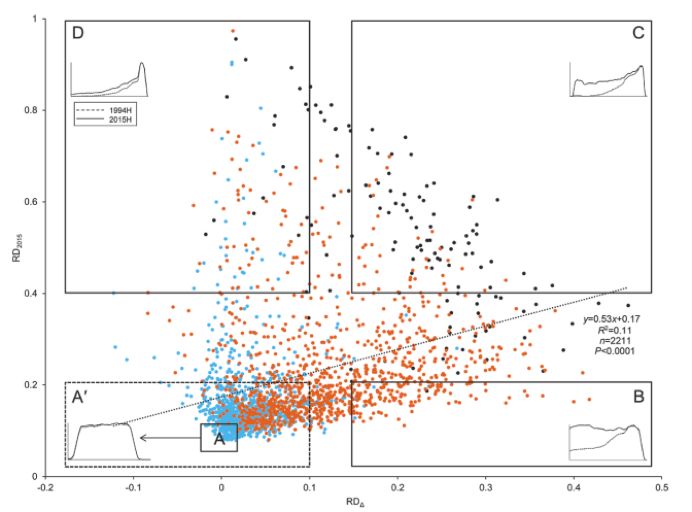 圖3. 比較2015H和1994H每個位置的轉(zhuǎn)錄本reads之間的平均歸一化測序深度