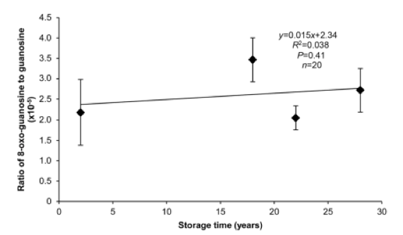 來自5’末端的轉(zhuǎn)錄本降解可以反映年齡相關(guān)的RNA氧化。最容易氧化的堿基,8-oxo-guanosine的豐度與總RNA中鳥苷豐度的比例與1989,1995,1999和2015年收獲的大豆種子胚軸的貯藏時間無關(guān)(圖5)。