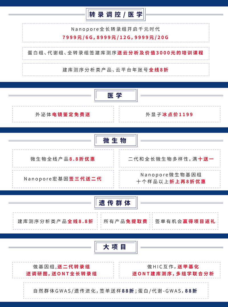 2018年即將結(jié)束,百邁客年末促銷活動正在火熱進行中!我們會為您設(shè)計實驗方案和最實惠的價格套餐;如果您的材料需要準(zhǔn)備,經(jīng)費即將到期,或項目有結(jié)余款項,可以考慮預(yù)付款的方式,我們也設(shè)計了多種預(yù)付款政策供您選擇,等待樣品準(zhǔn)備。我們多樣化的平臺及配套服務(wù),一定可以滿足您的需要。