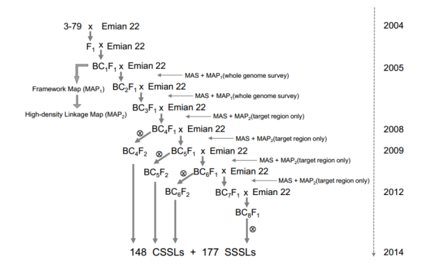 著絲粒區(qū)域鑒定:blastn,SPSS software (version 17.0)?;基因組共線性分析:MUMmer (version 3.23)GATK(version 3.1.1),Samtools(version 0.1.19)?MCScanX package;結(jié)構(gòu)變異檢測(cè):MUMmer3 (version 3.23);二倍體棉重測(cè)序SNPs鑒定:Trimmomatic (version 0.32),BWA;168個(gè)CSSLs群體SNPs鑒定:染色體片段置換系(CSSLs)的構(gòu)建(圖1),測(cè)序深度(6X),插入片段:350 bp,BWAGATKSamtools;CSSLs群體QTLs定位與表達(dá)分析:QTL IciMapping (version 4.0)?;TopHat2 (version 2.0.13)?Cufflinks (version 2.2.1);STRUCTURE (version 2.3)?;TASSEL software (version 5.0)?;