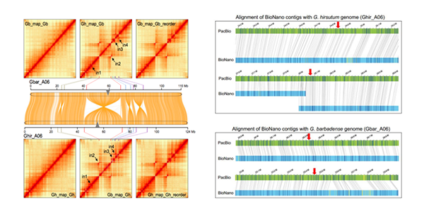 3?陸地棉和海島棉A06染色體倒位鑒定(左:Hi-C互作熱圖;右:光學(xué)圖譜鑒定)