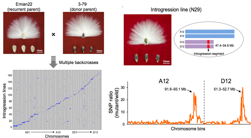 通過(guò)研究發(fā)現(xiàn)了在陸地棉(G.?hirsutum?acc. TM-1)和海島棉(G. barbadense?acc. 3-79)間存在廣泛的遺傳變異,進(jìn)一步推測(cè)這些變異的一部分可能是造成表型差異的原因,包括纖維性狀。為了利用這些變異進(jìn)行定向育種,研究人員構(gòu)建了一個(gè)漸滲系群體,旨在引入有利的變異,控制從G.barbadenseG. hirsutum等重要農(nóng)藝性狀的形成,如纖維質(zhì)量。研究人員通過(guò)分子標(biāo)記對(duì)168份漸滲系材料進(jìn)行測(cè)序,并鑒定了涵蓋所有26條染色體的466個(gè)基因滲入片段(圖6)。研究人員發(fā)現(xiàn)了在染色體D12中含有漸滲片段的漸滲系,其具有有限的絨毛纖維,類似于其供體親本G.barbadense?3-79(圖6,圖7上),基因滲入片段的位置與無(wú)絨天然突變體G. hirsutum?Xuzhou142fl的圖譜測(cè)序所示的位置相同,然而其遺傳基礎(chǔ)以前未被充分了解(圖7下)。這些結(jié)果表明,陸地棉(G. hirsutum)中無(wú)絨毛突變體的遺傳變異與海島棉(G. barbadense)中的數(shù)量性狀基因座(QTL)共定位。該漸滲片段與天然纖維突變體的特征將有助于比較分析海島棉和陸地棉之間的絨毛纖維起始機(jī)制。