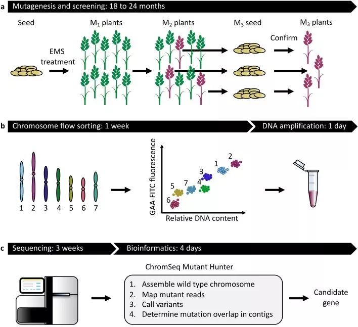 TILLING,即Targeting Induced Local Lesions IN Genomes(定向誘導(dǎo)基因組局部突變技術(shù)),是由Steven Henikoff領(lǐng)導(dǎo)的研究小組發(fā)展起來的,TILLING技術(shù)借助高通量的檢測(cè)手段,快速有效地從由化學(xué)誘變劑(EMS)誘變過的突變?nèi)后w中鑒定出點(diǎn)突變。目前此技術(shù)廣泛應(yīng)用于作物研究中,另外還有基因全基因組重測(cè)序的MutMap和MutMap +方法,實(shí)現(xiàn)功能基因的快速定位。MutRenSeq和MutChromSeq也應(yīng)用于突變基因定位,2016年John Innes Centre組織利用EMS誘變產(chǎn)生的小麥突變體,使用液相捕獲技術(shù),通過特異性的RNA捕獲探針對(duì)目標(biāo)區(qū)域進(jìn)行富集,二代測(cè)序后,通過比對(duì)野生型和抗性突變體的序列,找到了目標(biāo)抗性基因。MutChromSeq在此基礎(chǔ)上進(jìn)行改進(jìn),利用流式細(xì)胞儀技術(shù)將含目標(biāo)基因的單條染色體分離出來,后期結(jié)合高通量測(cè)序,通過比較突變體及野生型的差異,快速克隆基因,此方法大大降低重測(cè)序的難度,減少了其它染色體序列對(duì)目標(biāo)序列的影響。
