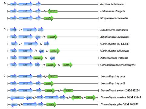 擬諾卡氏菌種是從鹽湖或堿性環(huán)境中分離出來的,其中有約三分之二的菌種嗜鹽或耐鹽。在高鹽環(huán)境下,擬諾卡氏菌可通過加固細(xì)胞壁和積累滲透因子等多種方式而使自身得以生存。鹽刺激條件下,滲透因子的累積可使得菌體在不影響其基本細(xì)胞進(jìn)程和常規(guī)代謝的情況下而保持菌體滲透平衡。其中在自然界含量最多的滲透因子便是四氫嘧啶,其可促進(jìn)蛋白折疊,并保護(hù)酶、核酸、抗體等生物分子,使細(xì)胞可應(yīng)對(duì)多種壓力環(huán)境。在所有的擬諾卡氏菌種中都有參與四氫嘧啶合成的相關(guān)基因。