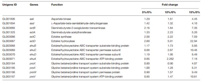 對(duì)菌種進(jìn)行二代測序,篩選FDR<0.01,F(xiàn)old Change≥2的基因?yàn)椴町惐磉_(dá)基因,并使用COG、GO、KEGG、Swissport和NR數(shù)據(jù)庫進(jìn)行注釋分析。通過COG分類,共獲得25個(gè)COG組別,其中氨基酸轉(zhuǎn)運(yùn)和代謝、碳水化合物轉(zhuǎn)運(yùn)和代謝是其主要組分。DEGs被分布在34個(gè)GO term里,其中包括細(xì)胞組分、分子功能和生物過程三大類。與此同時(shí),三個(gè)比較組(5%/0%, 10%/0%和15%/0%)差異表達(dá)基因分別富集到77、32和90條KEGG通路中,其中ABC轉(zhuǎn)運(yùn)受體,甘氨酸、絲氨酸和蘇氨酸代謝在鹽刺激下扮演相當(dāng)重要的角色。尤其在最大耐受度的NaCl鹽環(huán)境里,參與ABC轉(zhuǎn)運(yùn)受體通路的四氫嘧啶和羥基四氫嘧啶基因、甜菜堿基因和四氫嘧啶和羥基四氫嘧啶合成基因表達(dá)量都顯著提高。