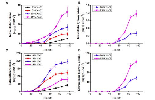 圖4、N. gilva?YIM 90087T菌種中四氫嘧啶和羥基四氫嘧啶的產(chǎn)生統(tǒng)計(jì)