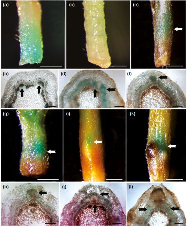 GUS信號在剪切后的0h主要在莖形成層和未成熟的木質(zhì)部存在,隨后在不定根誘導(dǎo)的2天后,越來越多的GUS信號聚集在形成層和次生韌皮部,3~4天,形成層、次生韌皮部和皮層的不定根原基細(xì)胞中出現(xiàn)GUS信號。在不定根誘導(dǎo)5天后,GUS信號在不斷增大的根原基逐漸降低并在第六天消失。結(jié)果表明,PagFBL1會參與不定根生成的初期階段,如誘導(dǎo)和萌生期,可參與生長素信號通路從而調(diào)控不定根的誘導(dǎo)和萌生。