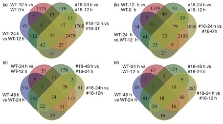 使用Illumina測序技術(shù)進(jìn)行轉(zhuǎn)錄組分析從而鑒定影響不定根生成的差異表達(dá)基因。不論在野生型還是過表達(dá)植株里,0h與12h的差異表達(dá)基因均多于12h vs. 24h和24h vs. 48h比較組。因此,在不定根誘導(dǎo)和萌發(fā)的前12h發(fā)生了大量基因的重塑。OE植株在前12h增加1518個差異表達(dá)基因,其中有119個基因在野生型的12h vs. 24h中出現(xiàn)(圖3)。這些結(jié)果表明,PagFBL1基因的高表達(dá)會增強(qiáng)促進(jìn)不定根形成的基因的表達(dá)變化。