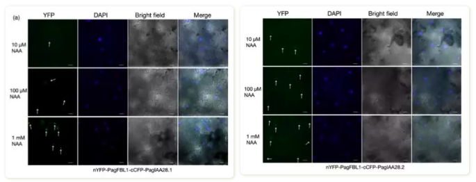使用雙分子熒光互補(bǔ)技術(shù),將15個Aux/IAA基因共轉(zhuǎn)染到煙草葉片,發(fā)現(xiàn)只有在nYFP-PagFBL1與?cCFP-PagIAA28.1?和cCFP-PagIAA.28.2共轉(zhuǎn)染后(圖5a)才會發(fā)現(xiàn)YFP熒光蛋白信號,且生長素濃度越高,信號越強(qiáng),而在其他組合中,只發(fā)現(xiàn)了DAPI信號(圖5b)。