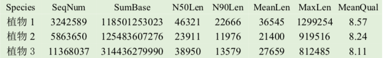 注:Species:分析的物種信息;SeqNum:各個(gè)長(zhǎng)度范圍內(nèi)序列的數(shù)目;SumBase:指各個(gè)長(zhǎng)度范圍內(nèi)序列的總長(zhǎng)度;N50Len:reads N50長(zhǎng)度;N90Len:readsN90長(zhǎng)度;MeanLen:平均reads長(zhǎng)度;MaxLen:最長(zhǎng)reads長(zhǎng)度;MeanQual:質(zhì)量值,準(zhǔn)確度=1-10^(-Q/10)