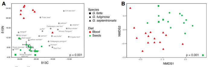 圖3. A:同位素δ15N?和?δ13C研究wolf與San Cristóba島上嗜血達(dá)爾文雀(Geospizaseptentrionalis)、小地雀(G. fortis)和中地雀(G.fuliginosa)食性,3者分別以紅三角、綠方形和綠圓形表示,其他動物(人類、狐貍和海鷗等)以灰圓形表示(來源于公開數(shù)據(jù));B:基于OUT的非度量多維尺度(NMDS)。不同食性(嗜血、食種子)的3種達(dá)爾文雀腸道微生物β多樣性。