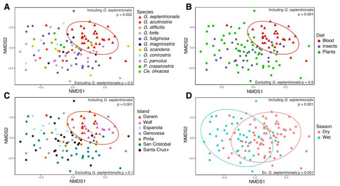 采樣:9個地緣隔離島,12種達(dá)爾文雀,114個糞便樣本,2個季度(旱季+雨季)。