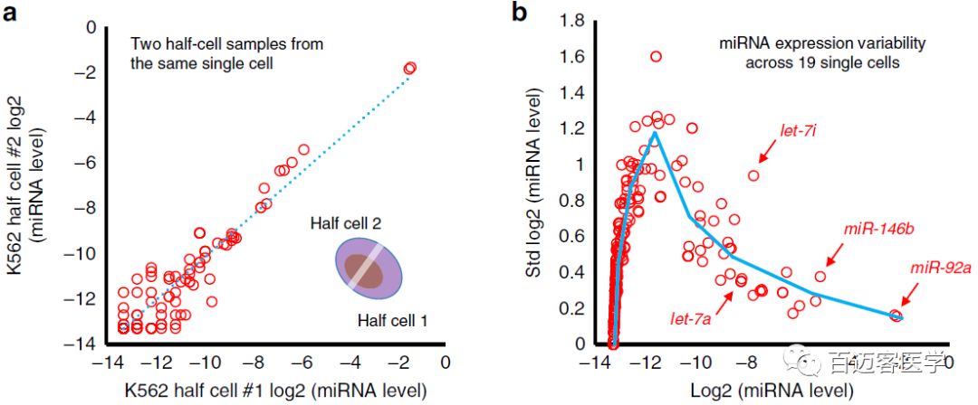 1、作者首先分別比較了來自同一細胞的半細胞單細胞microRNA測序和單細胞轉錄組測序之間的差異:該方法表現出良好的穩(wěn)健性(~95%成功率)和重現性(microRNA和mRNA的R2=0.93),產生可獨立驗證的成對半細胞microRNA和mRNA表達譜。