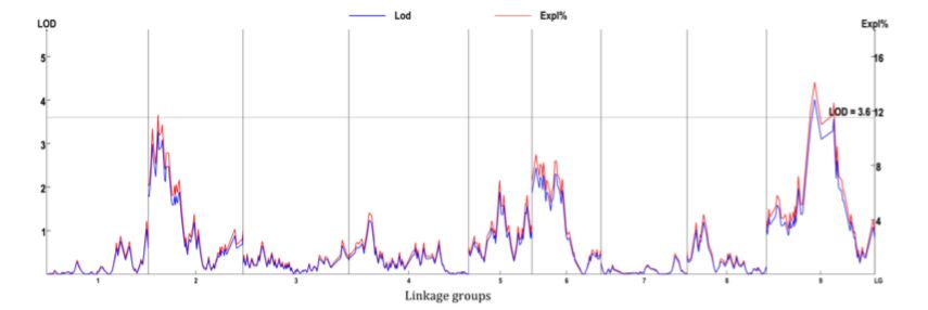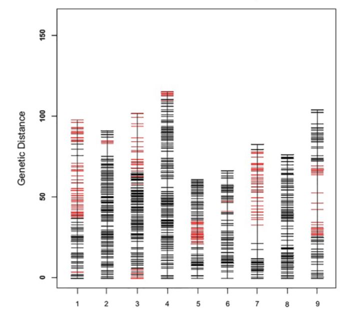 開發(fā)了185,349個(gè)SLAF標(biāo)記,其中,20,250個(gè)SLAF標(biāo)記可以成功分型,最終上圖的標(biāo)記為4787個(gè),分布于9個(gè)LG中,構(gòu)建一張平均圖距為0.22cM的遺傳圖譜(如下圖),標(biāo)記間最大gap超過10cM,這可能是由于小孢子培養(yǎng)構(gòu)建DH群體的過程中,可能某種基因型更容易形成胚胎和再生植株,從而產(chǎn)生偏分離或某段染色體區(qū)域中無(wú)個(gè)體發(fā)生重組。