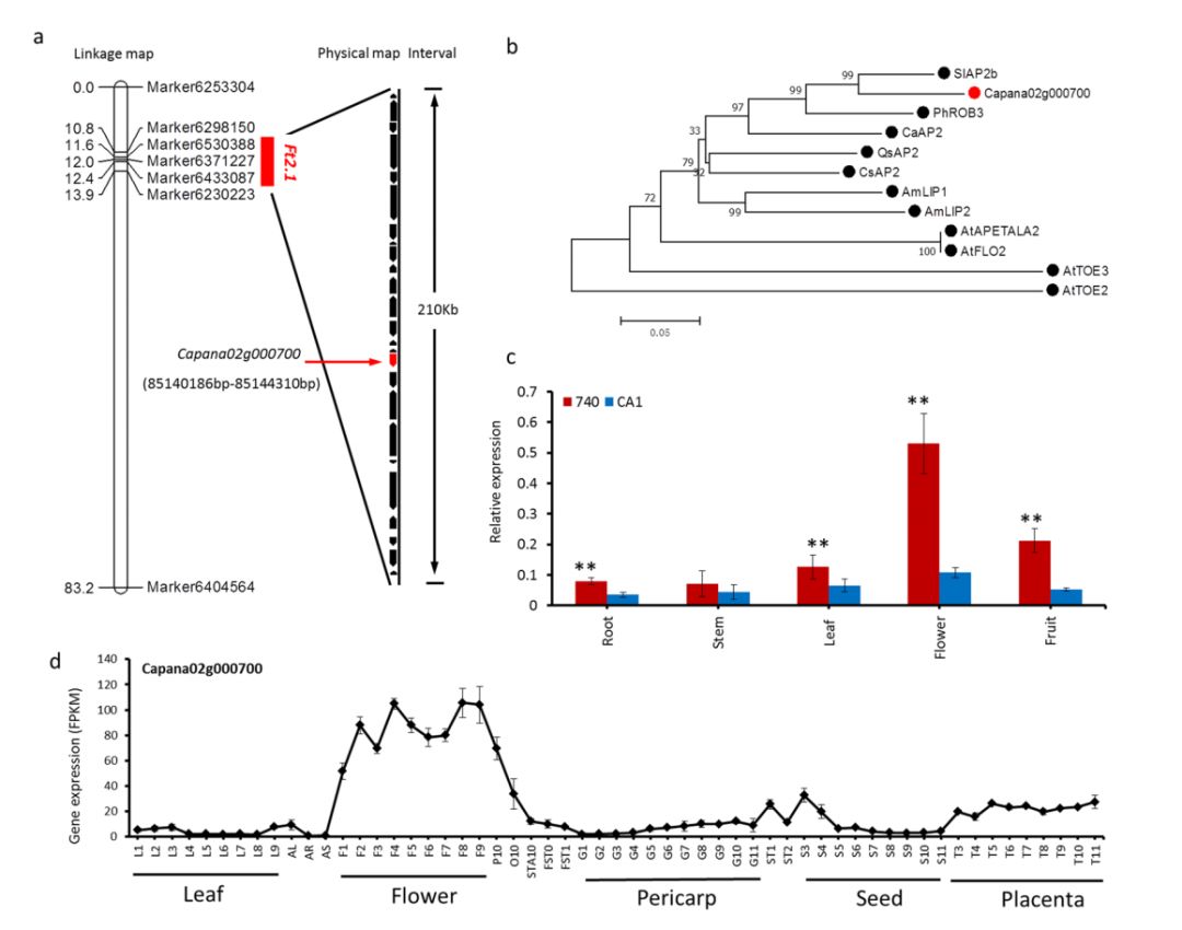 花期相關(guān)基因:針對(duì)主效QTL——Ft2.1進(jìn)行重點(diǎn)分析,它處于遺傳圖譜上的區(qū)間為0.763cM,對(duì)應(yīng)的Zunla-1基因組上物理區(qū)間為210Kb,包含25個(gè)基因,其中存在之前鑒定到的Capana02g000700基因,編碼花器官同源異型蛋白。進(jìn)化分析表明Capana02g000700的同源基因,金魚草LIP1和LIP2、擬南芥APETALA2和辣椒CaAP2,均在花器官發(fā)育階段存在重要作用。同時(shí),比對(duì)雙親間序列差異,發(fā)現(xiàn)8個(gè)SNP標(biāo)記和1個(gè)6bp的InDel標(biāo)記,這導(dǎo)致親本CA1存在2個(gè)氨基酸的缺失和5個(gè)氨基酸的改變。繼DNA層面分析之后,RNA層面的分析qRT-PCR和RNA-seq表明,這個(gè)基因在雙親間存在差異表達(dá),且在花器官中表達(dá)量最高,最終認(rèn)為Capana02g000700就是控制花期的候選基因。