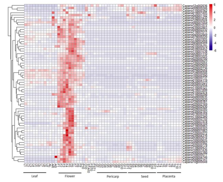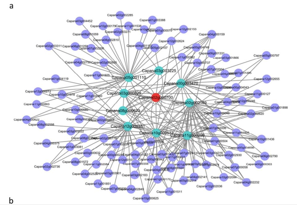 利用之前研究的不同發(fā)育階段和不同組織部的WGCNA分析結(jié)果,找到了花器官發(fā)育特定模塊,其中包含107個(gè)基因。這些基因中10個(gè)為TFs,其中就包含已鑒定的Capana02g000700,這表明這些TFs可能與花發(fā)育的轉(zhuǎn)錄調(diào)控相關(guān)。這107個(gè)基因中,發(fā)現(xiàn)9個(gè)基因與Capana02g000700高度共表達(dá),分為3個(gè)家族,且其功能均與花發(fā)育相關(guān)。上述,均表明Capana02g000700通過抑制靶基因和/或TF表達(dá)來(lái)控制花器官發(fā)育,進(jìn)而影響花期。