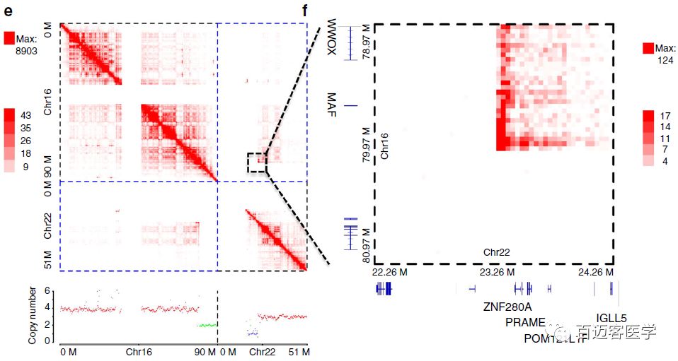 在RPMI-8226中,WGS鑒定出56個(gè)染色體間易位事件,其中四個(gè)也在top?100的Hi-C染色體間互作中,其中包括RPMI-8226的光譜核型(SKY)圖像中檢測(cè)到t(16,22)(q23,q11)的易位,涉及MM相關(guān)基因WWOXMAF。在U266細(xì)胞中,鑒定到了80個(gè)受易位事件影響的基因,包括癌癥相關(guān)基因TNIK、FBXW7、TRIM2,其中包含一些之前研究未發(fā)現(xiàn)的MM相關(guān)基因。此外距離易位位點(diǎn)1 Mb的基因中,有一半以上是相比于正常B細(xì)胞差異表達(dá)的。MM細(xì)胞系的染色體間整體互作count明顯高于正常B細(xì)胞。總的來說,這些結(jié)果表明,癌細(xì)胞基因組三維構(gòu)象受到染色體間易位的影響。