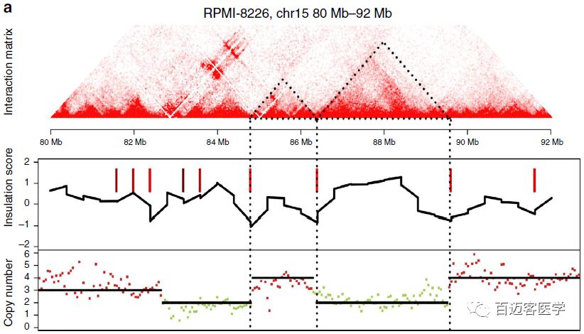 在RPMI-8226細(xì)胞中,WGS識(shí)別到了596個(gè)CNV斷點(diǎn),Hi-C識(shí)別到了3457個(gè)TAD邊界,比較發(fā)現(xiàn)CNV斷點(diǎn)常出現(xiàn)在TAD邊界附近。7.5%CNV斷點(diǎn)同時(shí)也是TAD邊界,30.7%CNV斷點(diǎn)位于TAD邊界120kb內(nèi)。CNV斷點(diǎn)與其最近的TAD邊界之間的距離明顯小于位置隨機(jī)斷點(diǎn)。U266細(xì)胞中的結(jié)果與RPMI-8226細(xì)胞中的相似,說明MM細(xì)胞CNV斷點(diǎn)與TAD邊界的相關(guān)性。而對(duì)正常B細(xì)胞中骨髓瘤CNV斷點(diǎn)處的平均絕緣分值的分析表明,正常細(xì)胞中TAD邊界也與癌癥CNV斷點(diǎn)有關(guān)。因此正常細(xì)胞中CNV斷點(diǎn)容易發(fā)生在TAD邊界,或者TAD在從正常向腫瘤的轉(zhuǎn)化過程中對(duì)破壞具有抵抗能力。