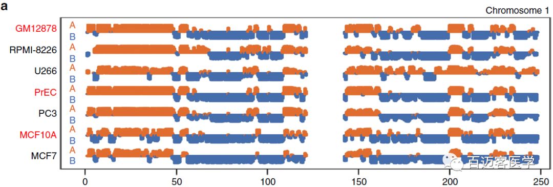 基因組的三維構(gòu)象與癌癥基因組的改變之間相互影響,比如A/B compartment轉(zhuǎn)換與基因表達(dá)的變化有關(guān),易位容易發(fā)生在空間鄰近度較高的區(qū)域的雙鏈斷點(diǎn)熱點(diǎn)。