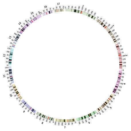 如果想自定義染色體排列順序,可以使用chromosomes_order參數(shù)來設(shè)定,假設(shè)在上圖的基礎(chǔ)上,想將hs11,hs12,hs13染色畫在前面,可以設(shè)置chromosomes_order=hs11;hs12;hs13;hs1;hs2;hs3;hs4;hs5;hs6;hs7;hs8;hs9;hs10;hs14;hs15;hs16;hs17;畫出的圖如下: