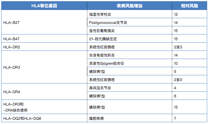 1972年Russel報(bào)告銀屑?。ㄅFぐ_)患者攜帶HLA-B13或HLA-B17。此后陸續(xù)發(fā)現(xiàn)大量其它疾病與特定的HLA相關(guān),其中,HLA-B27抗原見(jiàn)于大約90%的強(qiáng)直性脊椎炎病人,由此HLA-B27在臨床檢測(cè)中作為強(qiáng)直性脊柱炎的標(biāo)志物,以至使HLA分型具有了診斷價(jià)值,甚至,能較早地證實(shí)疾病亞型之間的臨床區(qū)別,例如,尋常銀屑病與HLA相關(guān),而膿皰性銀屑病則不然;青少年性胰島素依賴型糖尿病與HLA-B8、HLA-Bw15和HLA-B18相關(guān),而晚期發(fā)作型糖尿病并無(wú)這種相關(guān)性。因此,特定類(lèi)型的HLA便成為某些疾病的遺傳標(biāo)志。在疾病研究的延伸面,是關(guān)于HLA與長(zhǎng)壽的關(guān)系,目前亦形成一個(gè)新的研究熱點(diǎn)。目前研究比較清楚的幾個(gè)HLA與自身免疫疾病相關(guān)關(guān)系如下表: