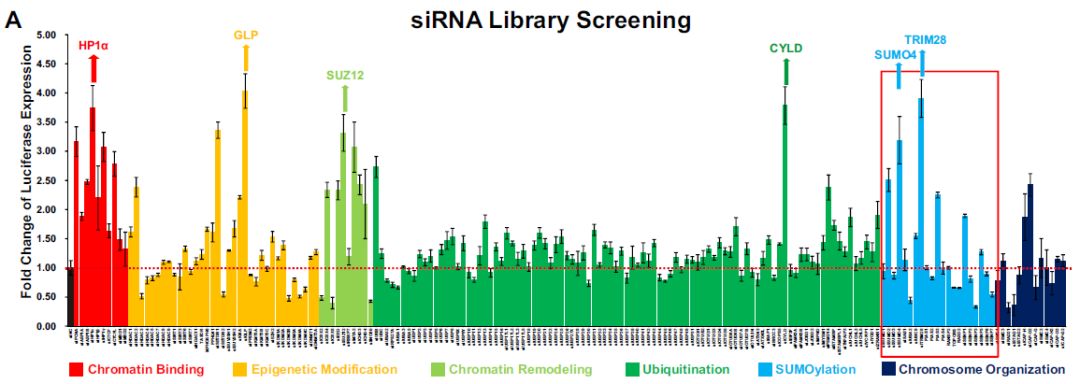 為了確定可能導(dǎo)致HIV-1抑制和潛伏的細(xì)胞靶點(diǎn),作者定制了siRNA文庫在ZM-bl細(xì)胞系中進(jìn)行高通量篩選,該文庫靶向細(xì)胞核內(nèi)的幾種細(xì)胞途徑的182個(gè)基因,包括chromatin binding, epigenetic modification, chromatin remodeling, ubiquitination, SUMOylation 和 chromosome organization。分析敲除各靶標(biāo)基因后熒光素酶的表達(dá)水平變化(以siNC為對(duì)照),許多蛋白質(zhì)對(duì)應(yīng)的熒光素酶表達(dá)升高,表明這些蛋白限制HIV-1啟動(dòng)子的活性,最明顯包括HP1α、GLP、SUZ12和CYLD,其已被鑒定為抑制HIV-1轉(zhuǎn)錄。其中,兩個(gè)較少見的SUMO化途徑基因TRIM28和SUMO4敲低后,顯著上調(diào)了HIV-1啟動(dòng)子活性。