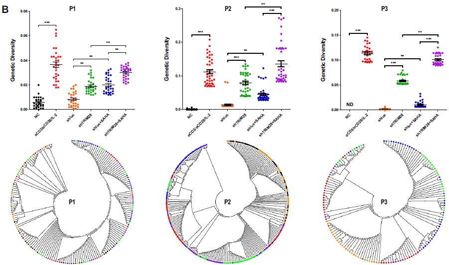 之后作者試圖確定TRIM28的敲低是否在接受抑制性cART療法至少6個(gè)月的HIV-1感染者的靜息CD4+T細(xì)胞中重新激活潛伏的HIV-1?;诩?xì)胞內(nèi)HIV-1 RNA的定量,表明用αCD3/αCD28刺激顯著誘導(dǎo)HIV-1的表達(dá)。TRIM28敲低重新激活了與HDAC抑制劑SAHA相似量的HIV-1 RNA表達(dá)。在將TRIM28敲低與SAHA組合后,重新激活效果更顯著。同樣,SUMO4敲低和SAHA添加的組合使用可以重新激活比單獨(dú)使用更多的HIV-1 RNA表達(dá)。雖然TRIM28單獨(dú)缺失重新激活相似數(shù)量的具有SAHA的遺傳多樣化HIV-1表達(dá),但TRIM28敲低和SAHA的組合重新激活了更多遺傳多樣化的HIV-1表達(dá)。