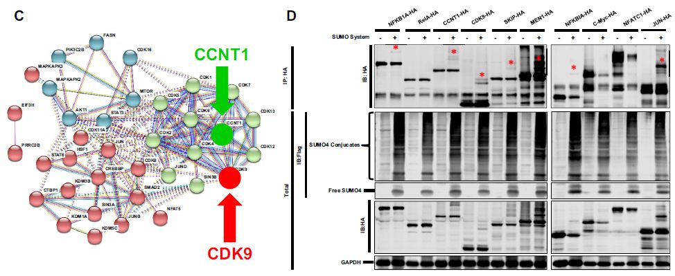 為了鑒定由TRIM28 SUMO化的候選底物,作者進(jìn)行了全局位點(diǎn)特異性SUMO化質(zhì)譜(SUMO-MS),鑒定了1,329個(gè)SUMO化蛋白,并構(gòu)建了相互作用置信度為0.7的STRING互作網(wǎng)絡(luò),MCODE分析發(fā)現(xiàn)STRING核心網(wǎng)絡(luò)可以聚類成12個(gè)亞群。GO分析發(fā)現(xiàn)細(xì)胞和代謝過程是SUMO化蛋白可能參與的前兩個(gè)生物過程。通過k-means聚類特異性地將轉(zhuǎn)移酶和轉(zhuǎn)錄因子聚類,并用STRING分析進(jìn)行可視化,發(fā)現(xiàn)許多候選蛋白對(duì)于HIV-1表達(dá)是關(guān)鍵的,例如JUN、JUNB、JUND、mTOR、STAT3、Cyclin T1(CCNT1)和CDK9。將SUMO化蛋白鑒定的顯著性閾值調(diào)低到10^-8,CDK9仍然排名靠前。作者在體外驗(yàn)證了全局位點(diǎn)特異性SUMO-MS的可靠性。