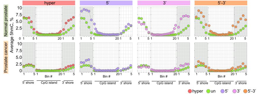 文章結(jié)果發(fā)現(xiàn)在5’或3’不對稱甲基化的CpG島邊界,正常細(xì)胞中具有高甲基化,但廣泛甲基化的或雙向甲基化堆積的CpG島在island shores具有高甲基化水平。正常組織中5hmC對DNA去甲基化及未甲基化CpG島的保護(hù)具有重要作用。此外癌組織中5hmC大范圍的減少可能會(huì)參與CpG島的超甲基化。文章采用3對前列腺癌樣本進(jìn)行5hmC與5mC檢測,正常組織中表現(xiàn)出增強(qiáng)的CpG島shores 5hmC水平,且基因CpG島DNA甲基化堆積伴隨shores處5hmC的降低。