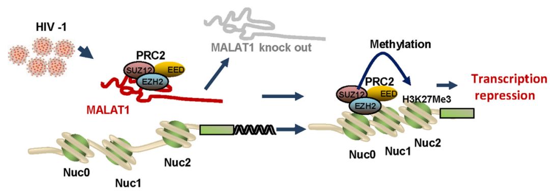 Qu D, Sun WW, Li L,?et al.?Long noncoding RNA MALAT1 releases epigenetic silencing of HIV-1 replication by displacing the polycomb repressive complex 2 from binding to the LTR promoter.?Nucleic Acids Res.?2019 Feb 21.