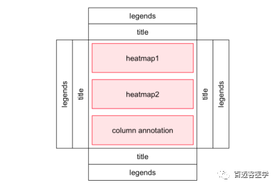 單個(gè)熱圖由熱圖主體和熱圖組件組成。 熱圖主體可以按行和列分割。 熱圖組件是標(biāo)題,樹(shù)形圖,矩陣名稱和熱圖注釋,它們放在heamap體的四個(gè)側(cè)面上。