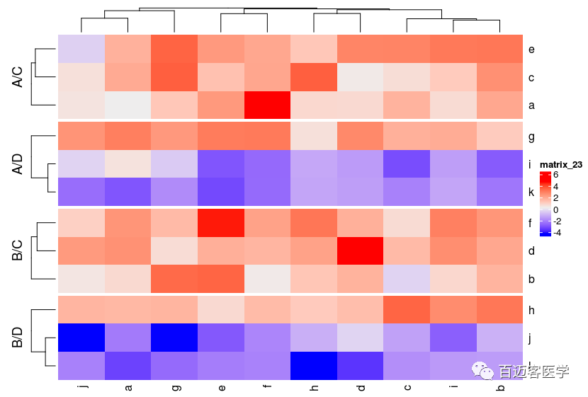 Heatmap(mat,?split?=?rep(c(“A”,?“B”),?6))Heatmap(mat,?split?=?data.frame(rep(c(“A”,?“B”),?6),?rep(c(“C”,?“D”),?each?=?6)))