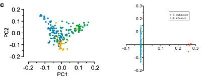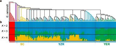共計選擇了243份二倍體棉花材料:230份亞洲棉G. arboreum?(A2)?和13份草棉G. herbaceum?(A1),來自于中國南部(SC),長江(YZR)和黃河(YER)。以雷蒙德氏棉(G. raimondii)為外群,構建系統發(fā)育樹顯示,G. herbaceum(草棉)和G. arboretum(亞洲棉)聚類成2個獨立的群(見圖2a和b)。G. arboretum(亞洲棉)進一步又分為SC,YZR和YER三個群,顯示了地理分布模式的差異,進而利用PCA分析支持這一結果(見圖2c)。