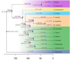 比較基因組分析:直系同源基因鑒定:?OrthoMCL (version 2.0);系統發(fā)育樹構建與分化時間估算:?MUSCLE、Gblocks (version 0.91b)和RaxML(version 8),MCMCTREE評估分化時間;基因家族擴張和收縮分析:CAFE(vertion 3.1);染色體共線性分析、4DTV檢測及Ks值計算:MCscan。