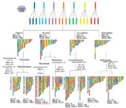 在構樹基因組中共發(fā)現15,254個基因家族,與桑樹分化之后,有431個基因家族擴張,230個基因家族收縮,表明在適應進化過程中,構樹中更多的基因家族經歷了擴張而不是收縮。另外,與苜蓿、毛楊和甜橙相比,轉錄因子發(fā)生明顯收縮(58個家族共1,342個轉錄因子,占蛋白編碼基因的4.4%)。肌動蛋白在植物的生長和發(fā)育的很多層面扮演著重要的角色,在酵母和很多動物中,肌動蛋白僅被一個單基因編碼。在構樹中僅發(fā)現4個肌動蛋白,少于藻類、小立碗蘚和無油樟。