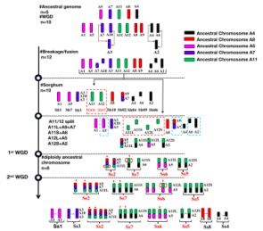 AP85-441基因組的組裝顯示了S. spontaneum的染色體數目從10降到8,而這與頻繁復制的古復制染色體對相關,通過與高粱的聚類比對,發(fā)現高粱祖先5號染色體和8號染色體同源物經歷了染色體裂變(見圖2)。SbChr05(A12)的祖先染色體斷裂分為兩個主要部分,即C5S(A12S)和C5L(A12L),分別轉移到SbChr06(A2)和SbChr07(A5)的祖先染色體;SbChr8(A11)的祖先染色體斷裂為兩個主要的部分,即C8S(A11S)和C8L(A11L),分別轉移到SbChr09(A6)和SbChr02(A7 + A9)的祖先染色體中。SbChr8和SsChr5之間及SbChr5和SsChr7之間近乎同源的短片段是在高粱與甘蔗分化前,高粱SSA形成于13.4 MYA同源基因的殘留物,同時發(fā)現,S5中較小的SSA區(qū)域和S8中SSA的較大區(qū)域在重排的AP85-441基因組中也是保守的。