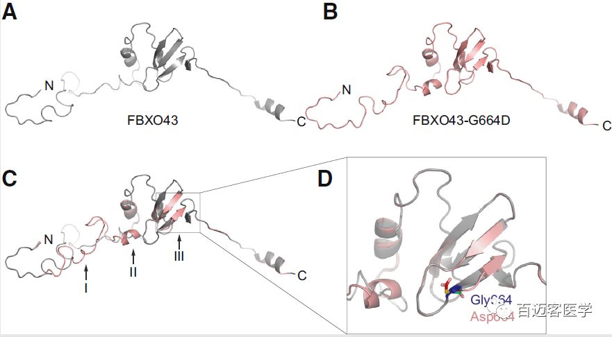 FBXO43(c.1991C>T)非同義突變導致FBXO43蛋白664殘基從非極性氨基酸(Gly甘氨酸)轉(zhuǎn)變?yōu)閹ж撾姾傻陌被幔ˋsp天冬氨酸)(G664D)。蛋白質(zhì)二級結構通過in silico結構模型預測,與野生型相比,具有2個明顯縮短的β-折疊(殘基654-668)、額外產(chǎn)生的α-螺旋(殘基610-613)和明顯變化的loop(殘基583-618)。
